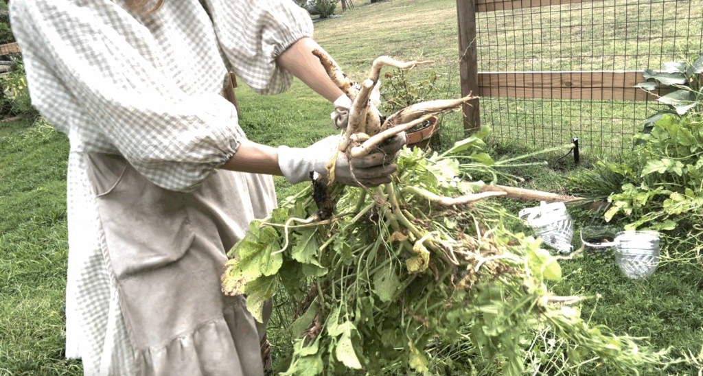 I laughed, but she wasn’t joking. Daikon radishes are powerful growers. Their roots are strong enough to push through compacted earth – and apparently, even through concrete if given the chance!