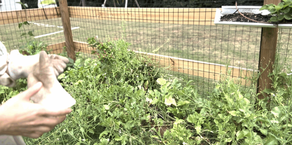 The tops of all the Daikons that I overplanted. They flowered and the butterflies loved them. I cut the tops off of most of these and fed them to the chickens.